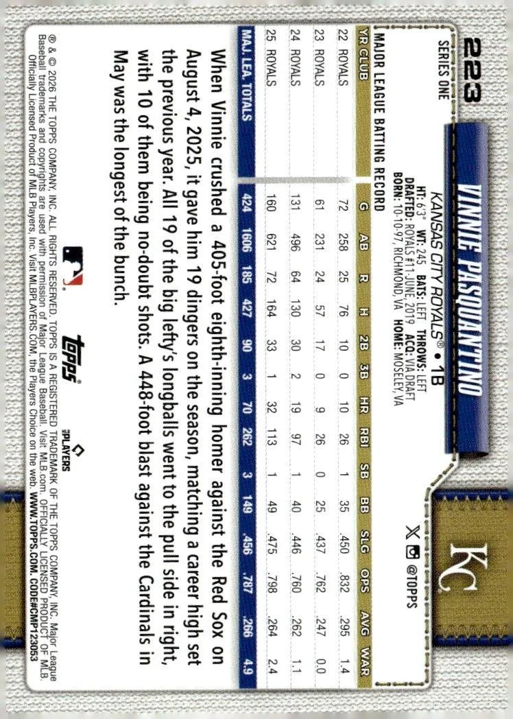 This is a nice example of a 2026 Topps #223 Vinnie Pasquantino