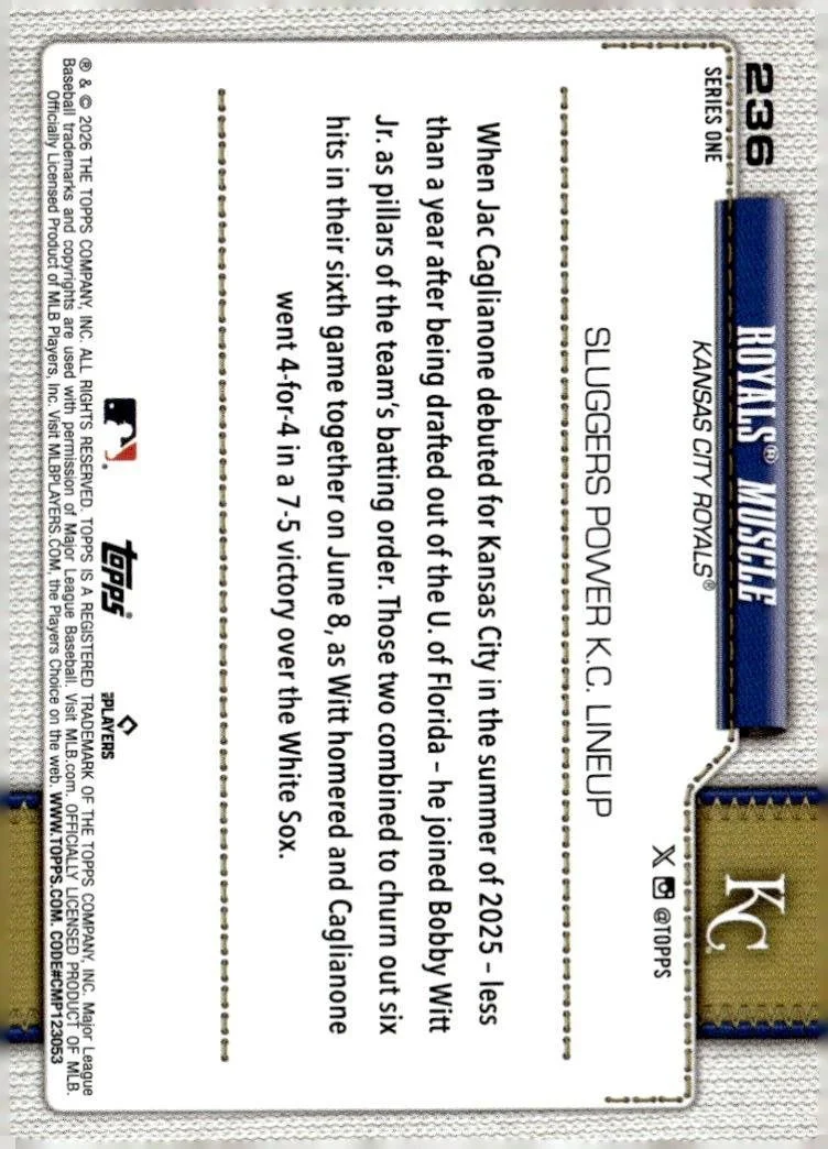This is a nice example of a 2026 Topps #236 Royals Muscle (Bobby Witt Jr. / Jac Caglianone)