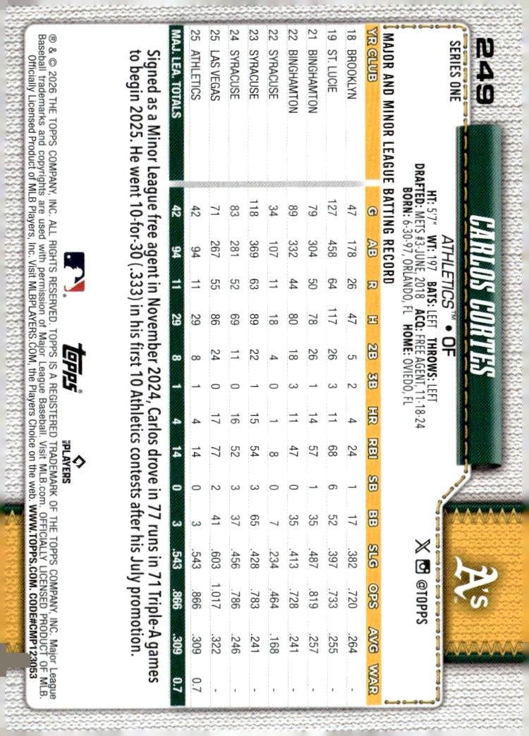 This is a nice example of a 2026 Topps #249 Carlos Cortes