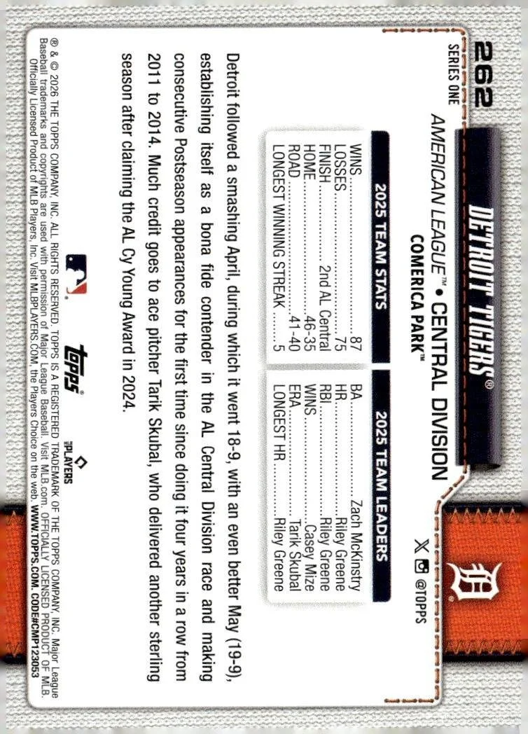 This is a nice example of a 2026 Topps #262 Detroit Tigers