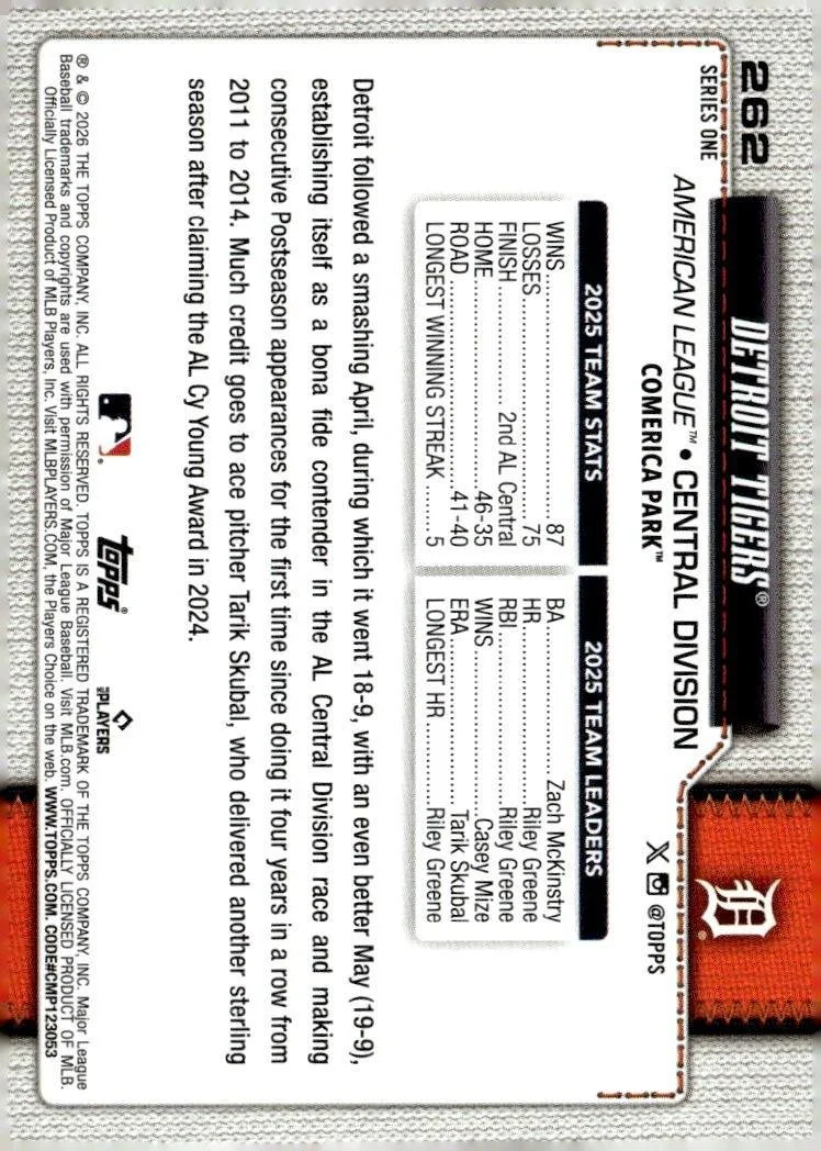 This is a nice example of a 2026 Topps #262 Detroit Tigers