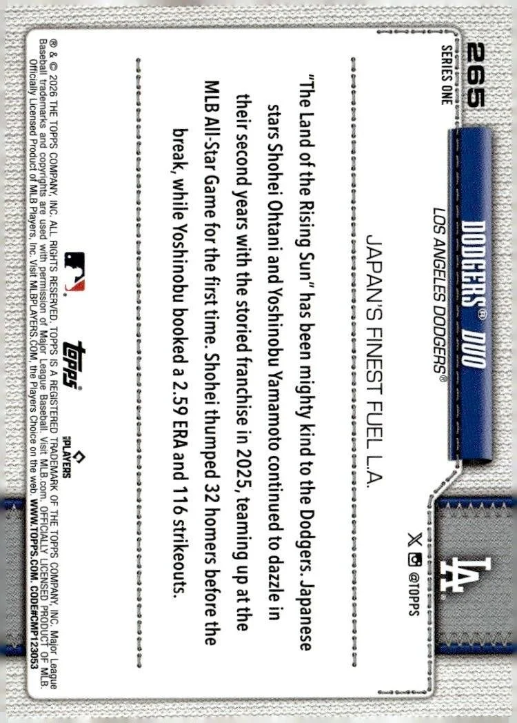 This is a nice example of a 2026 Topps #265 Dodgers Duo (Shohei Ohtani / Yoshinobu Yamamoto)