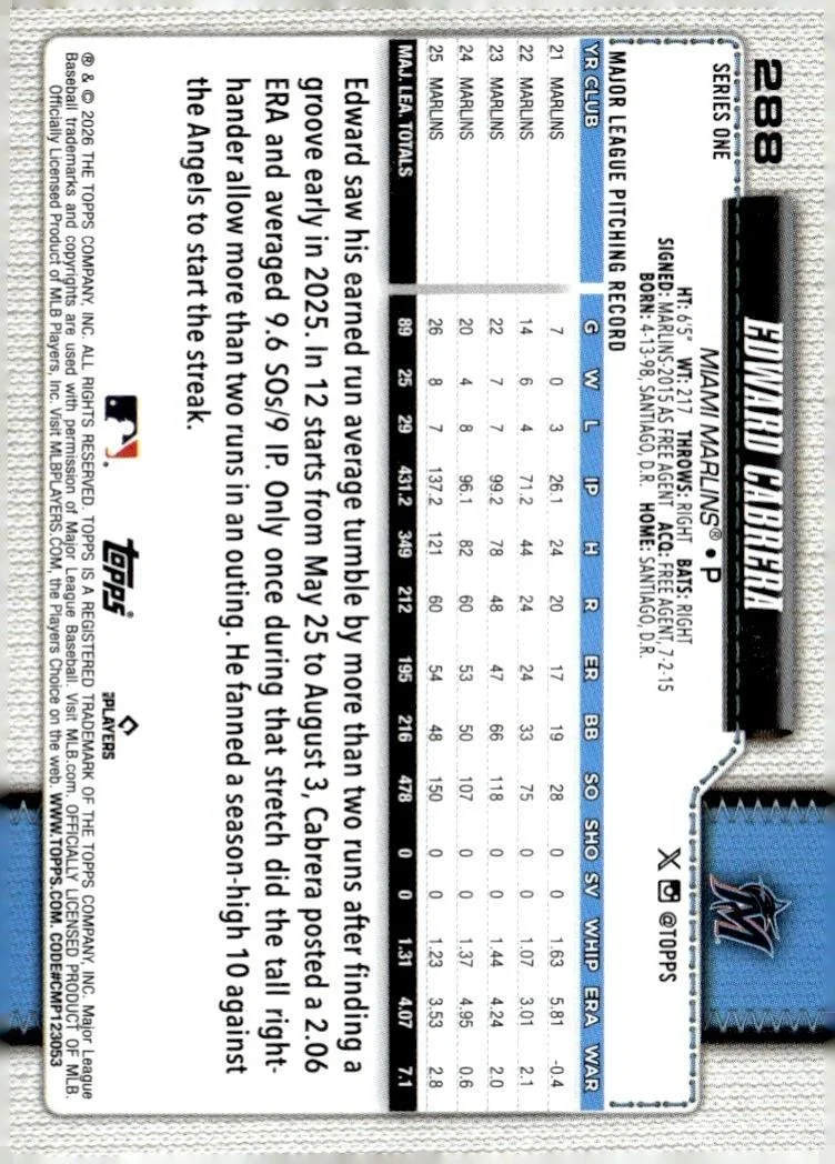 This is a nice example of a 2026 Topps #288 Edward Cabrera