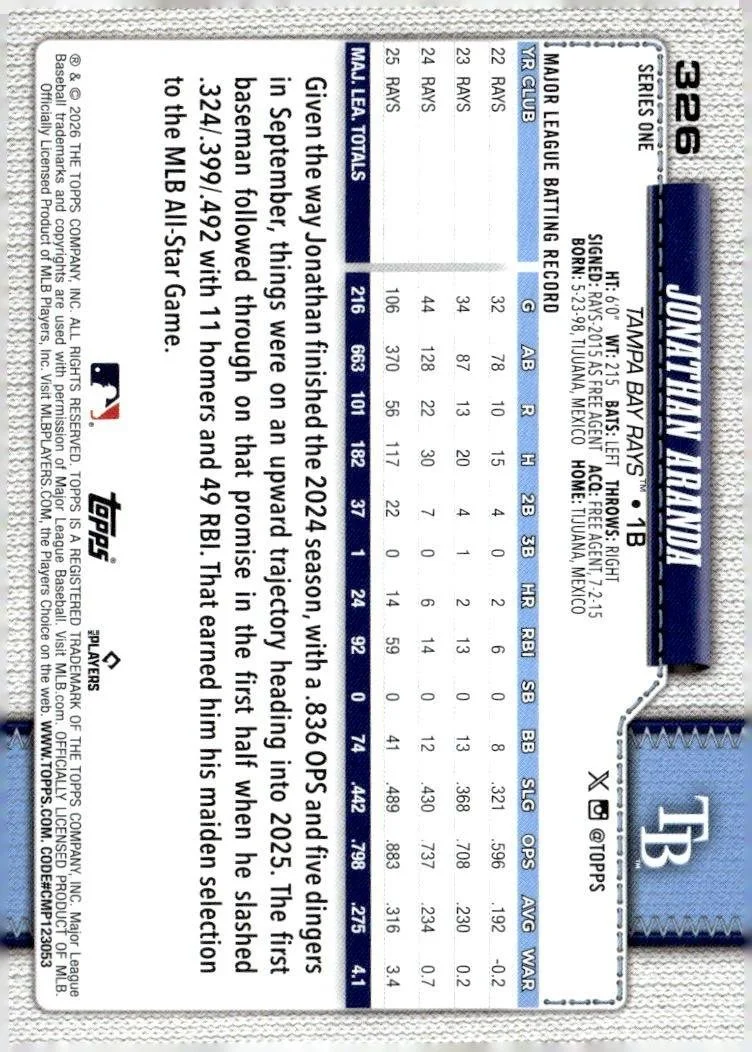 This is a nice example of a 2026 Topps #326 Jonathan Aranda