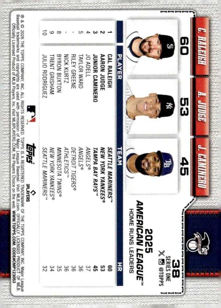 This is a nice example of a 2026 Topps #38 American League Leaders HRs