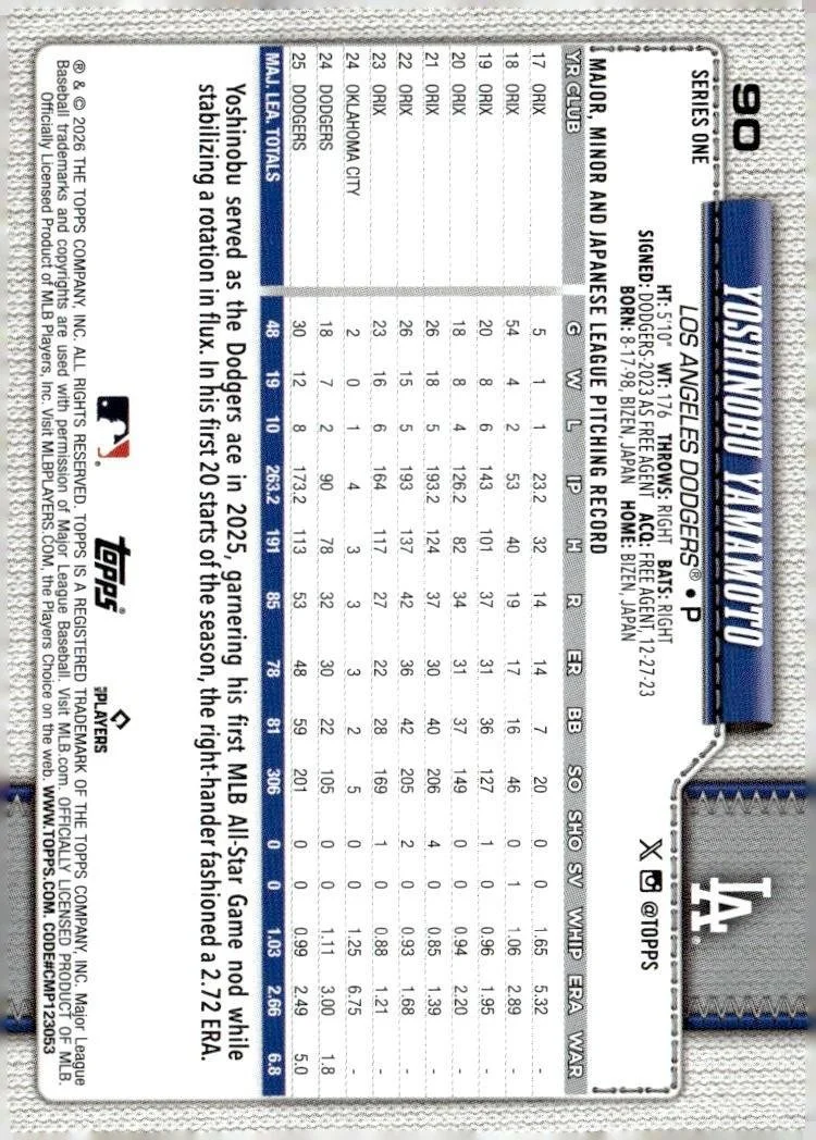 This is a nice example of a 2026 Topps #90 Yoshinobu Yamamoto