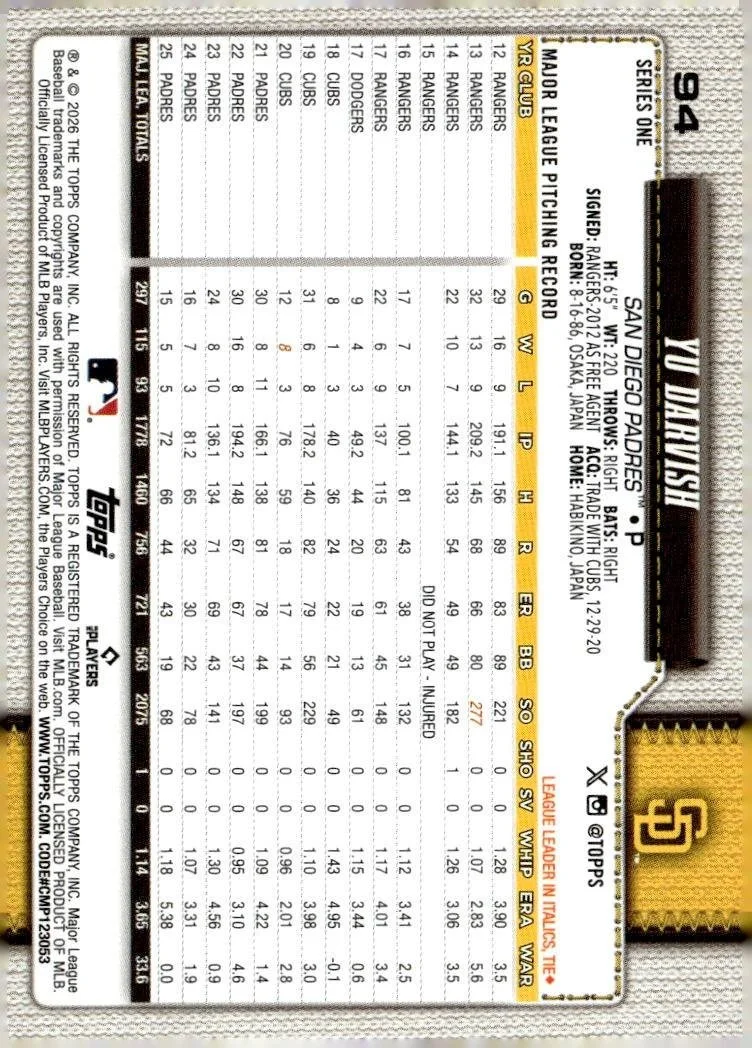 This is a nice example of a 2026 Topps #94 Yu Darvish