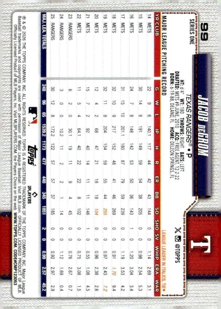 This is a nice example of a 2026 Topps #99 Jacob deGrom