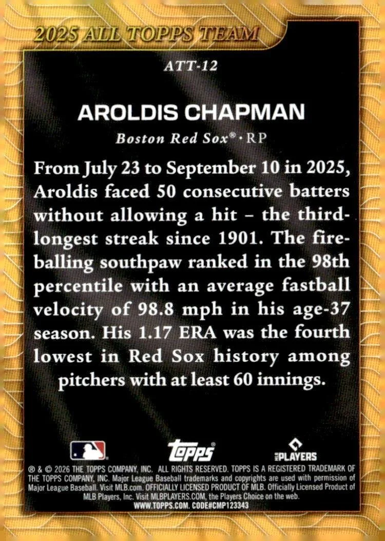This is a nice example of a 2026 Topps #ATT-12 Aroldis Chapman 2025 All Topps Team