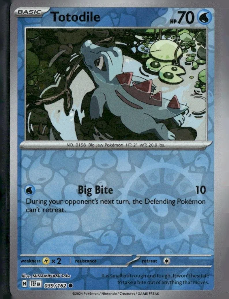 This is a nice example of a SV05: Temporal Forces #039/162 Totodile Reverse Holo