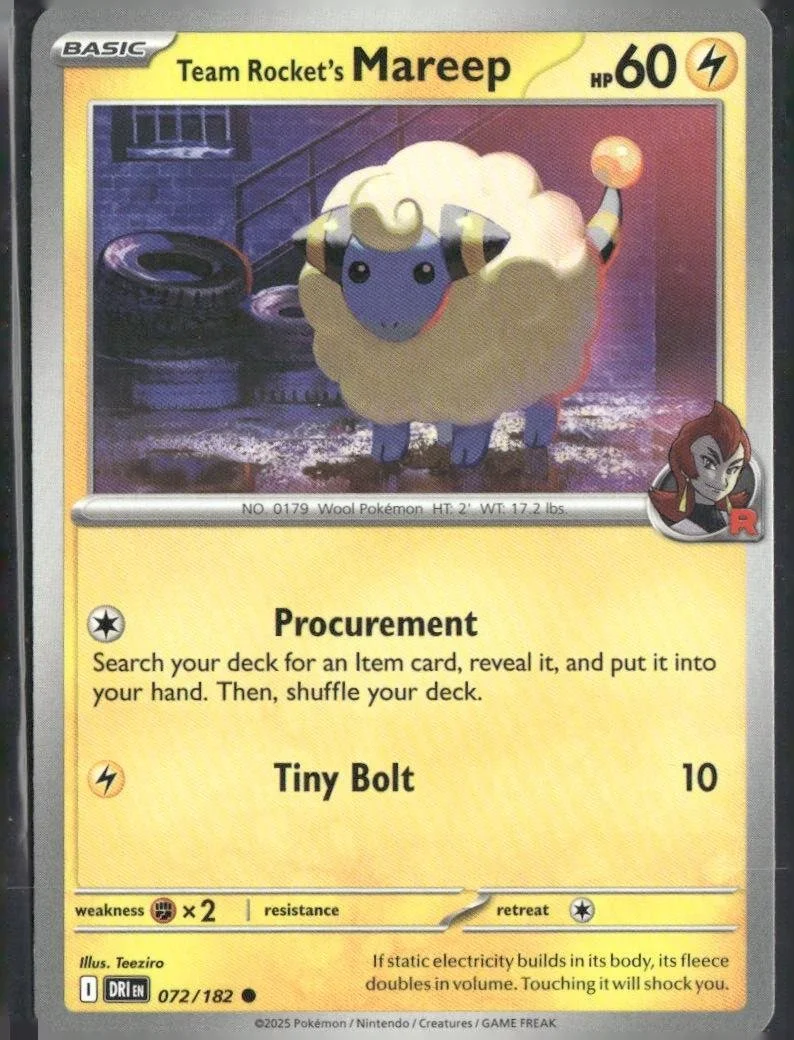 This is a nice example of a SV10: Destined Rivals #072/182 Team Rocket's Mareep