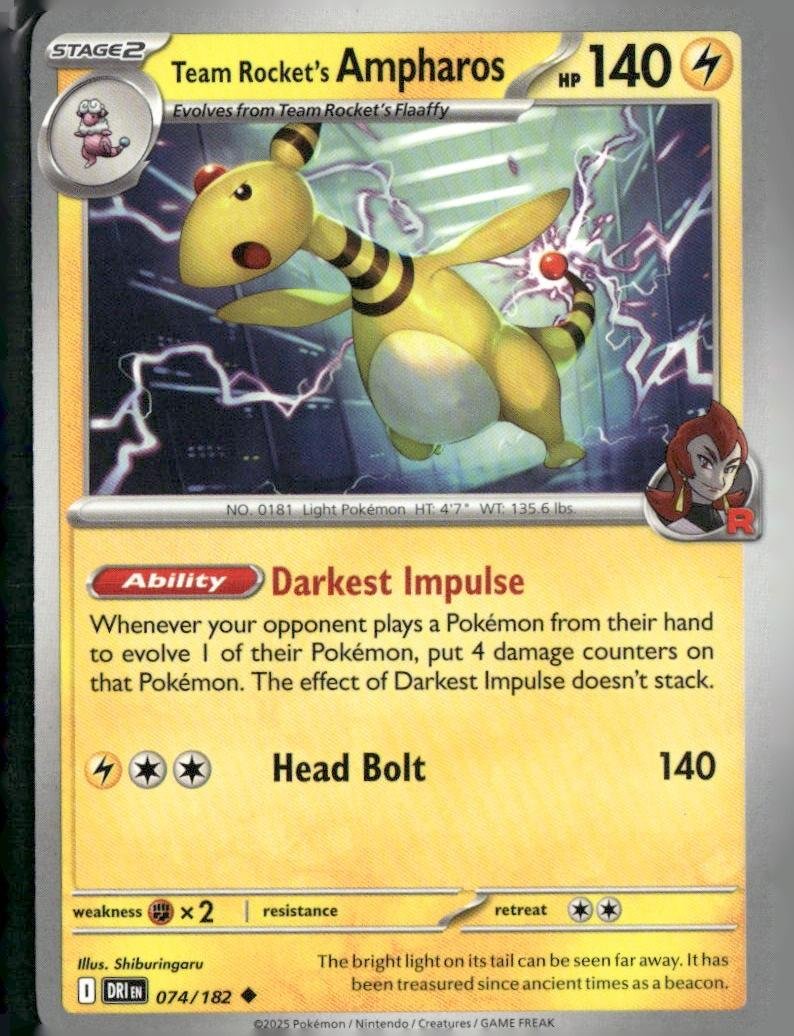 This is a nice example of a SV10: Destined Rivals #074/182 Team Rocket's Ampharos