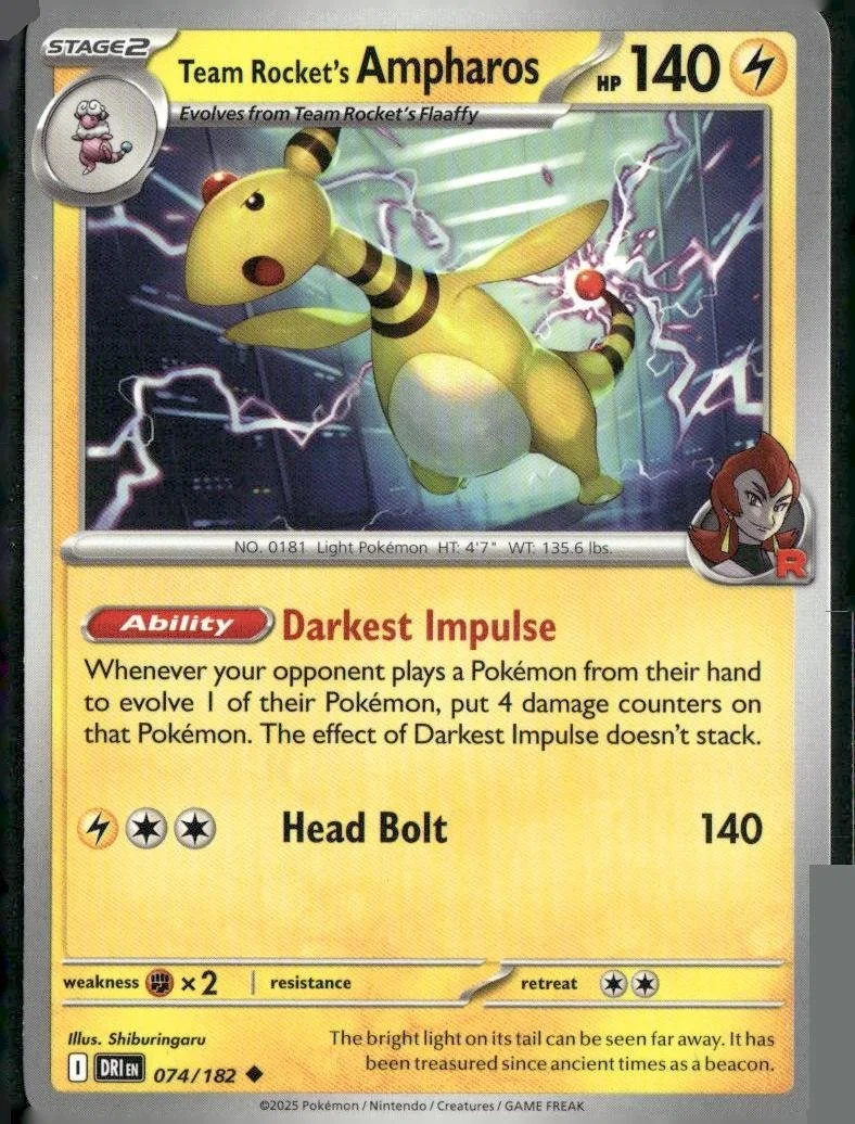 This is a nice example of a SV10: Destined Rivals #074/182 Team Rocket's Ampharos