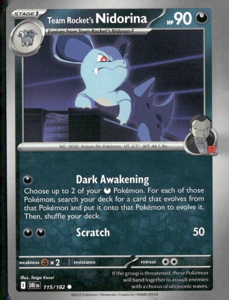 This is a nice example of a SV10: Destined Rivals #115/182 Team Rocket's Nidorina