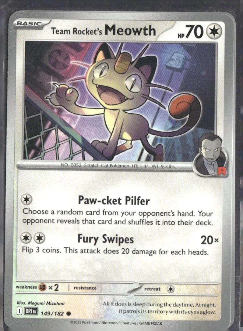 This is a nice example of a SV10: Destined Rivals #149/182 Team Rocket's Meowth